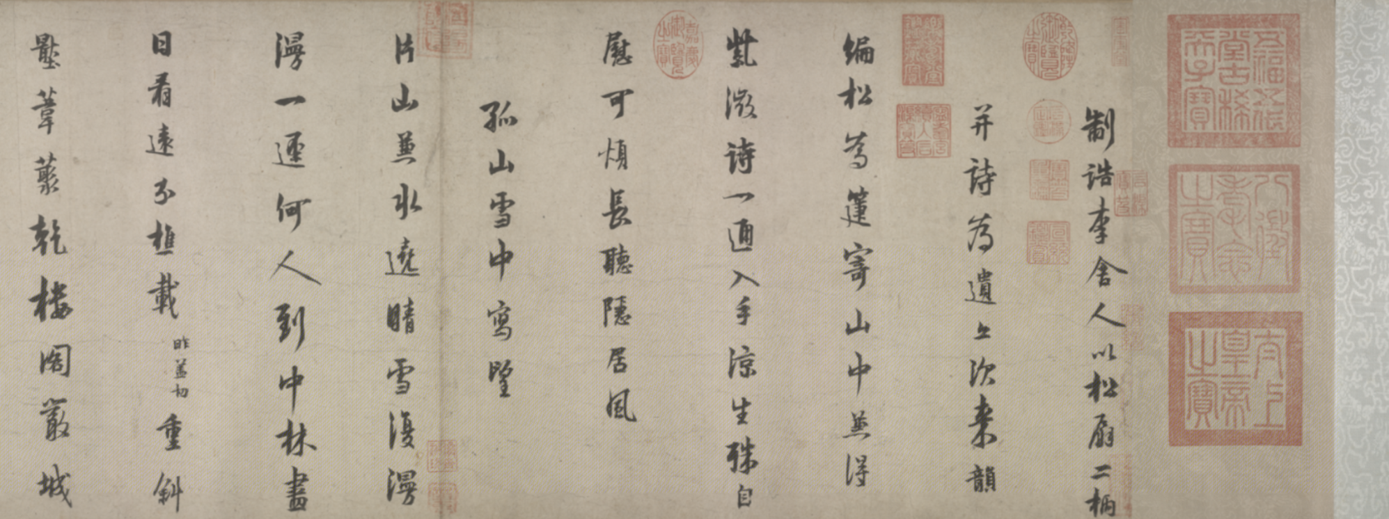 - 该卷为林逋手书自作诗合集,包含《松扇五诗卷》《孤山雪中》《孤山松亭》三组诗作,卷末附有苏轼题跋。该手卷采用行书书写,字势修长挺拔,运笔劲健中含虚和之气,结体疏密有致,整体呈现出林逋"清瘦遒劲"的独特书风;全卷以行书书写于砑花素笺纸上,装裱形制为北宋流行的'宣和装'