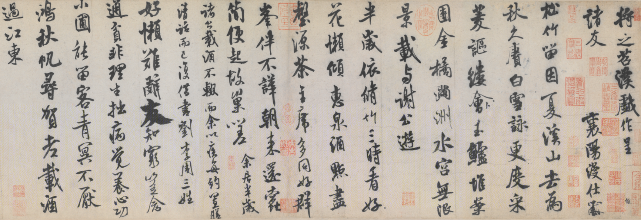 - 全卷纵30.3厘米,横189.5厘米,包含35行394字,内容为六首以“将之苕溪戏作呈诸友”开篇的自撰诗,卷末署年款“元祐戊辰八月八日作”;该卷以中锋运笔为主,融合正、侧、藏、露等锋势变化,点画波折连贯自然,结体舒展且中宫微敛。字体多向左攲侧,呈现险中求稳的态势,兼具颜真卿书法笔意与自我创新特色