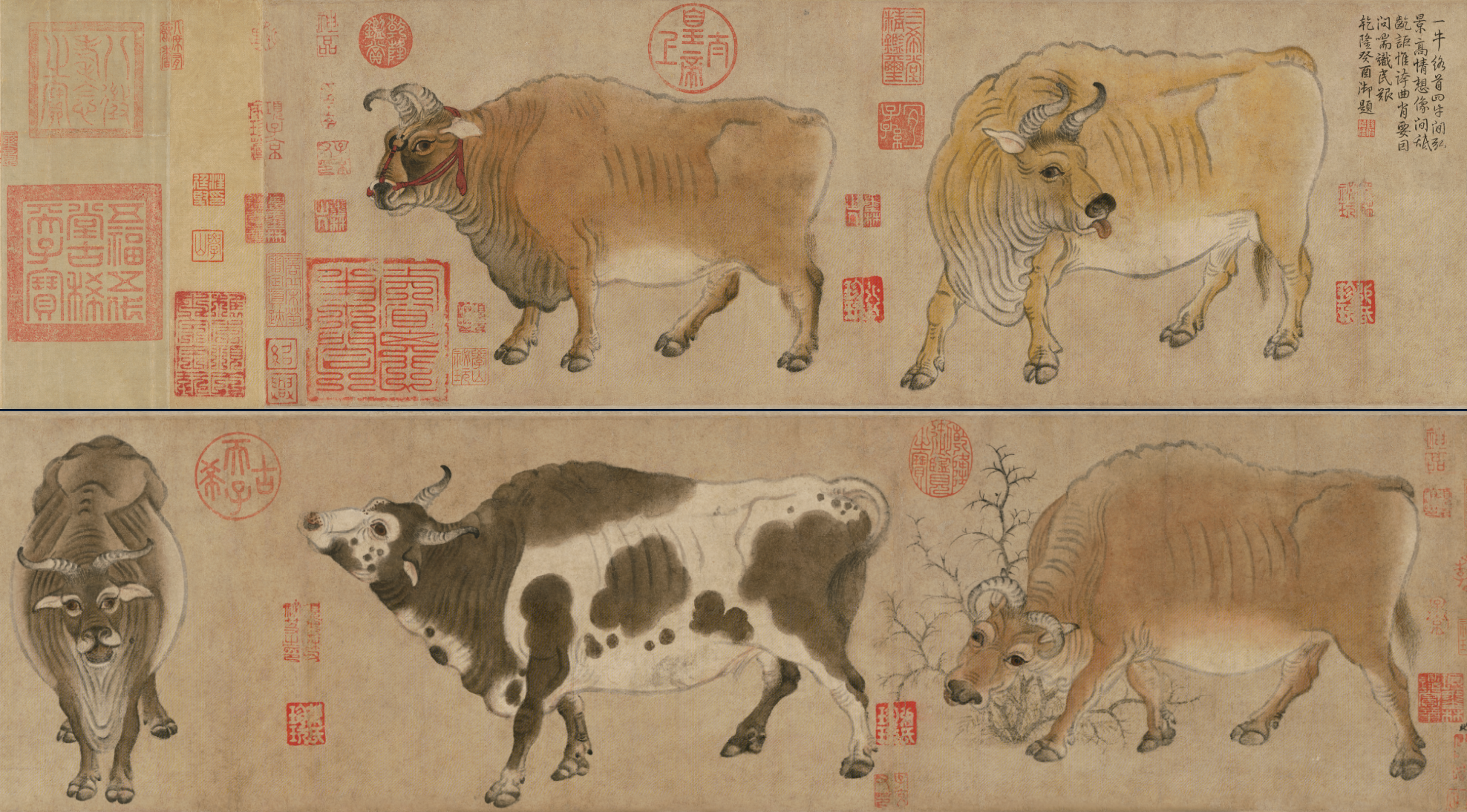 - 《五牛图》纵 20.8 厘米,横 139.8 厘米,横卷中的五头牛从右至左一字排开,各具状貌,姿态互异。一俯首吃草荆棵蹭痒,一翘首前仰缓步前行,一纵峙而鸣,一回首舐舌,一络首而立。整幅画面除最后右侧有一小树外,没有其他的背景,因此每头牛可独立成章