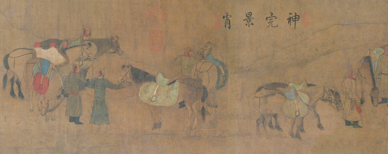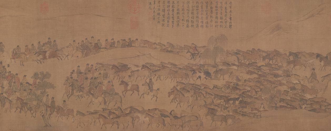 - 画中展现了皇家牧场的浩大场景:马倌赶着拥挤的马群在丘陵中鱼贯出现,马匹在平川上散开,自由自在地吃草、奔跑、嬉戏、翻滚。全卷共描绘马匹一千二百八十六匹,牧者一百三十四人,千姿万态,有聚有散,有虚有实,构思非常巧妙,场面也极为壮阔