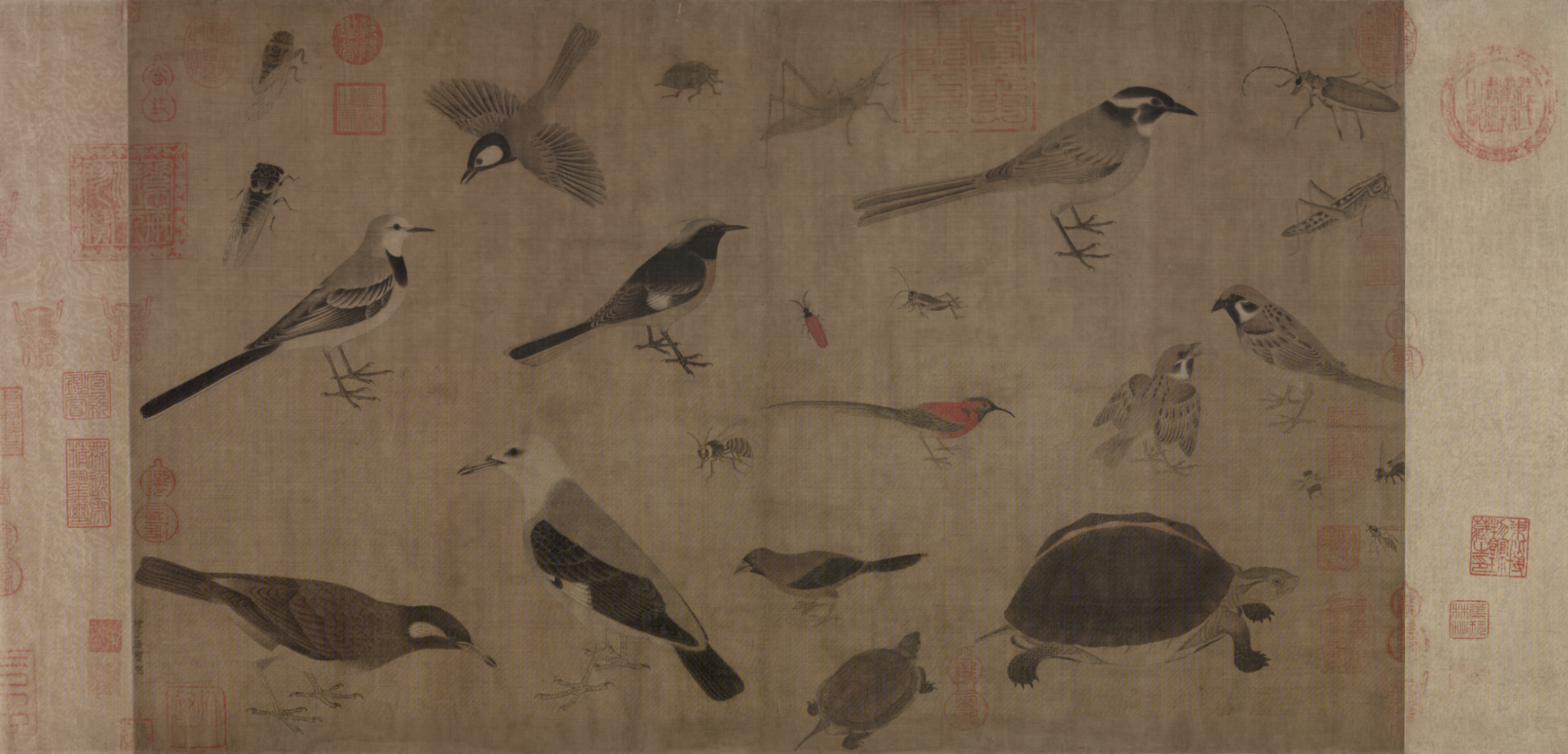 - 纵41.5厘米,横69.5厘米;图中采用“勾勒法”(先用细而淡的墨线勾勒出物体的部位和轮廓,然后填彩)画了鹡鸰、麻雀、鸠、龟、昆虫等动物二十余件,排列无序,但每一件动物都刻画得十分精确、细微,甚至从透视角度观之也无懈可击。左下方有“付子居宝习”的款字,可知为给其子黄居宝摹习的范本