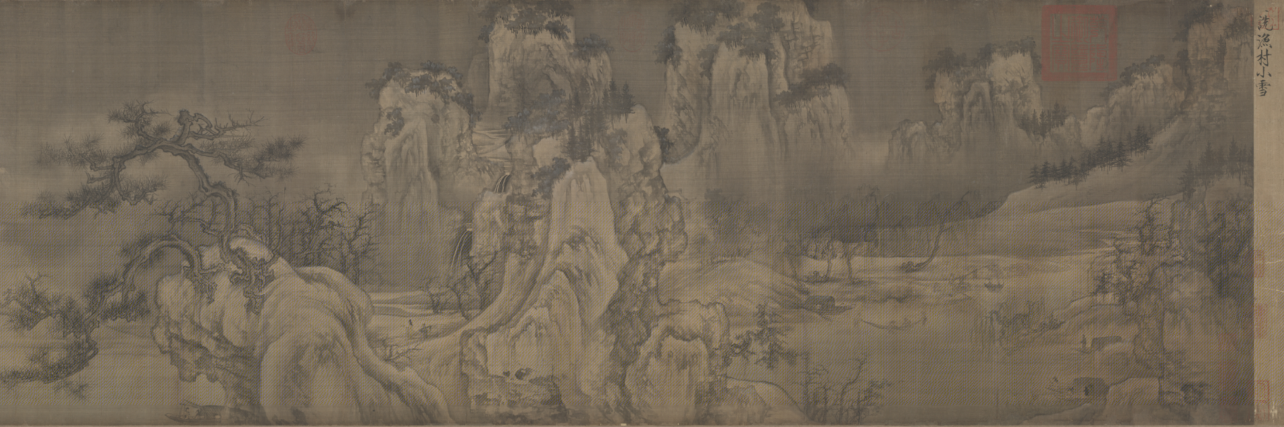 - 绢本,纵:44.4厘米,横:219.7厘米,描写冬季小雪初霁的渔村山林景色。图中雪山奇松,溪岸渔艇,峰回路转,步移景易,整个画面意境萧索,笼罩在一片空灵、静寂的氛围之中,虽有渔夫艰苦劳作,但反映的却是文人逸士向往山林隐逸生活的雅致情怀