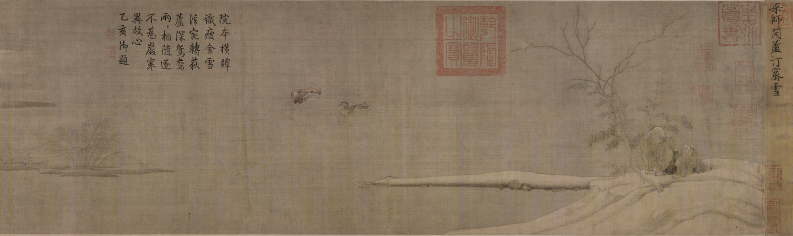 - 《芦汀密雪图》画的是密雪覆盖着沙清丘岸的芦塘小景,湖水尚未封冰,一对鸳鸯在水中游戏戏,一对㶉鶒在沙渚上小牺,暮风低垂,寒风萧索,描绘出空旷清幽景象