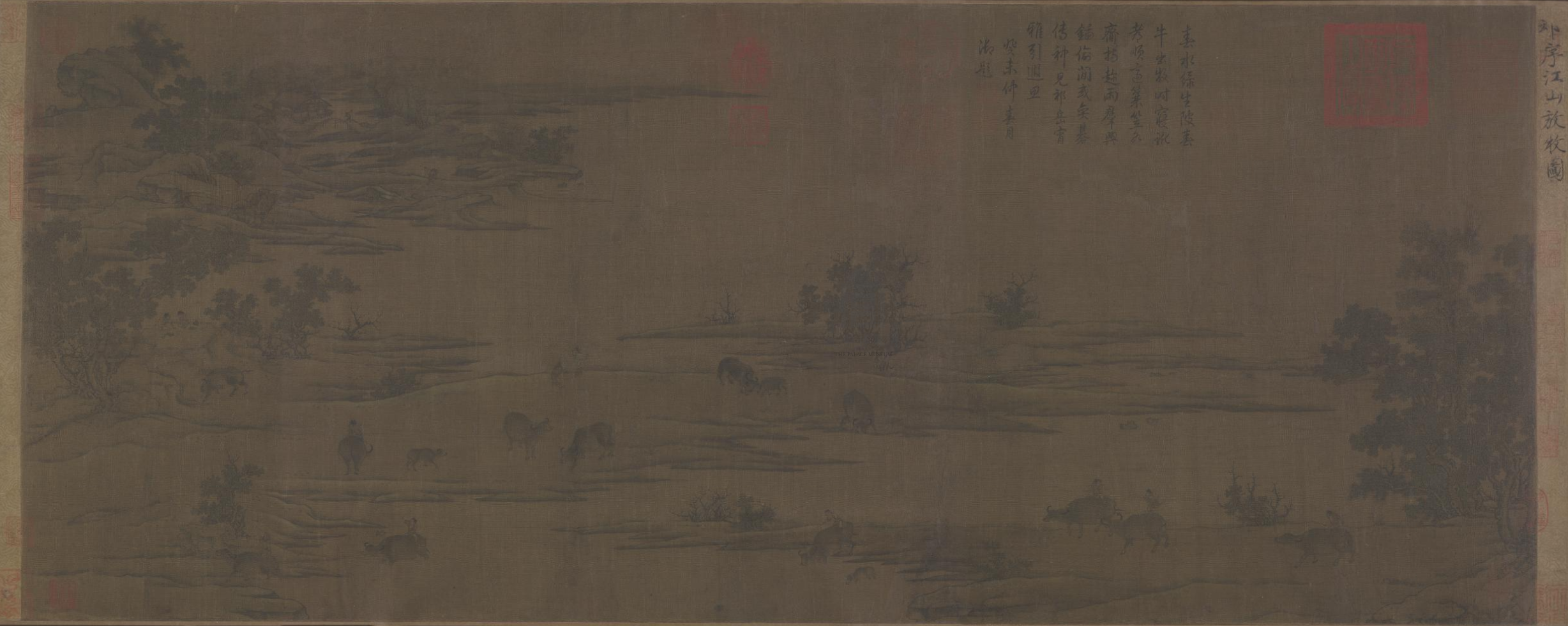 - 此画描写江南水乡儿童放牧的情景。画面上,江面开阔,山坡平缓,草木茂盛,十多头牛散布于江畔与江水之中,饮水、觅草、闲步、涉江,姿态不一。牧童们或牵牛背吹笛,或拍板唱和,或围坐弈棋,或放飞风筝,自由自在,天真烂漫。远处阡陌纵横,田畴连绵,农夫们荷锄而归