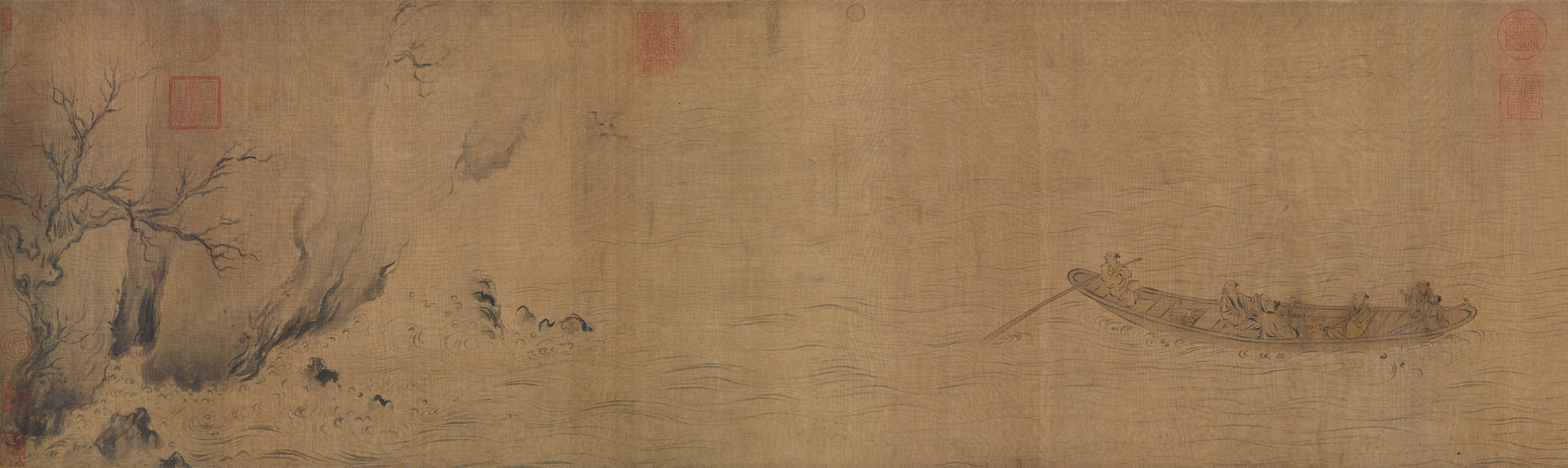 - 《赤壁后游图》描写北宋文学家苏轼夜游赤壁的故事。画面夜色茫茫,江水浩荡,一叶扁舟随波漂泊,船中三人对坐,游玩赏景。该图人物生动传神,笔法工中带写,运笔流畅,衣纹作兰叶描,设色淡雅