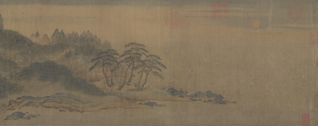 - 图绘南宋都城临安郊外风凰山一带景色碧波万顷,红日初升,茂林长松,惊起翔鹤飞鸿,川间琼楼金阙隐约可见;属青绿山水,笔法清细繁复,格调柔丽雅洁,显示出南宋皇家贵胄的审美情趣