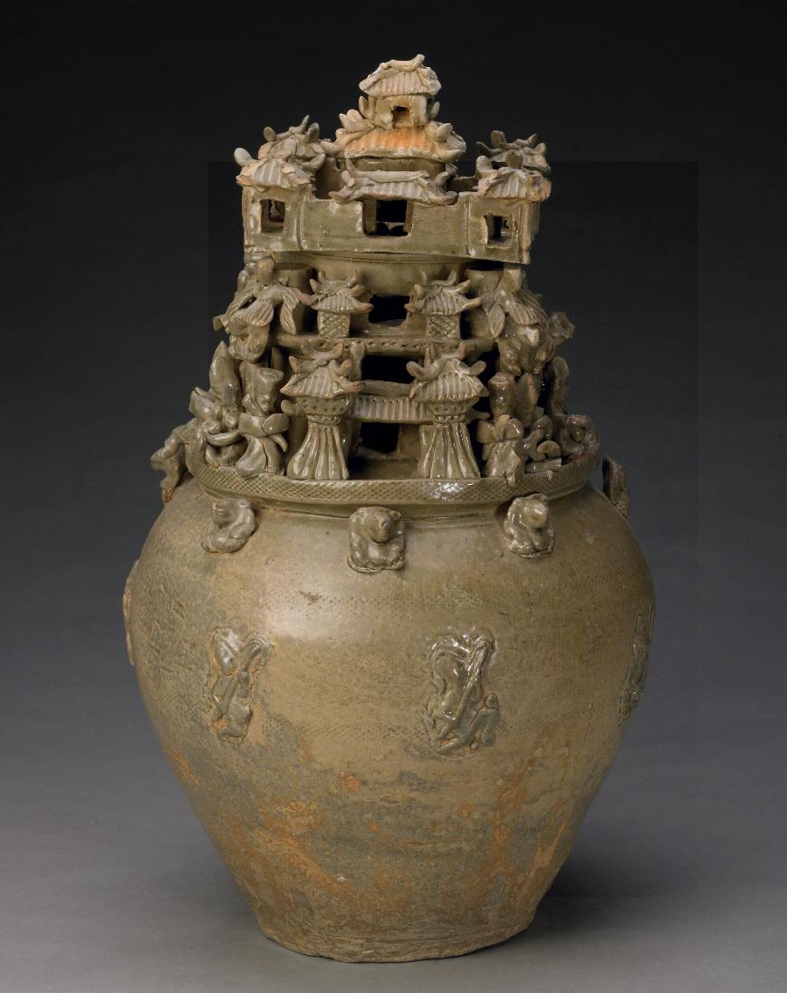 - 器物胎质灰白施青釉,高46.4厘米,分上下两部:上部堆塑三层楼阁、双阙亭台及奏乐侍仆、鸟兽,下部罐体贴塑龟驮碑及人畜形象,碑刻“永安三年”铭文与祈愿文字。整体通过建筑群像、百鸟争食、牲畜满栏等场景
