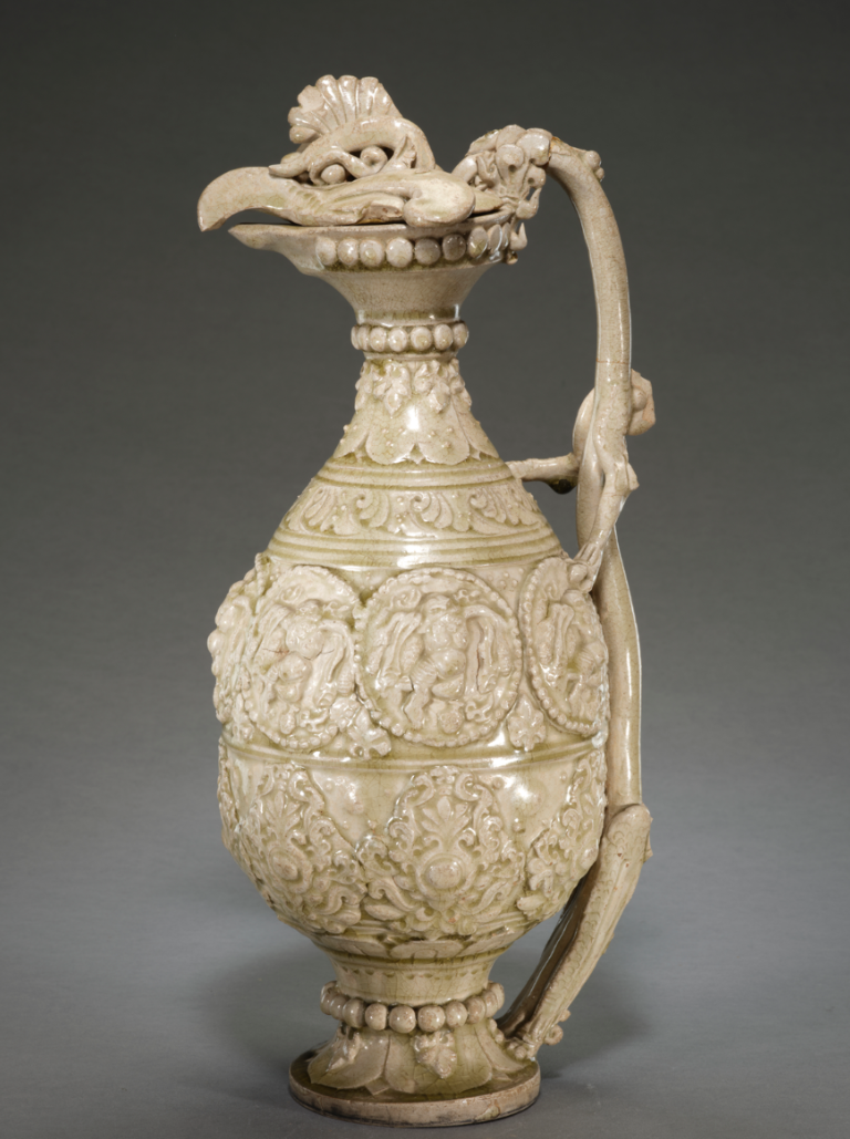 - 壶通高41.3cm,口径19.3cm,足径10.2cm,通体青釉,纹饰新颖,盘口形、细颈,斜溜肩,腹部自上而下逐渐圆鼓,下腹缓收,圈足呈喇叭形。腹部塑贴主体纹饰两层,上为6个联珠纹圆形开光,内有手舞足蹈的力士;下为宝相花6朵