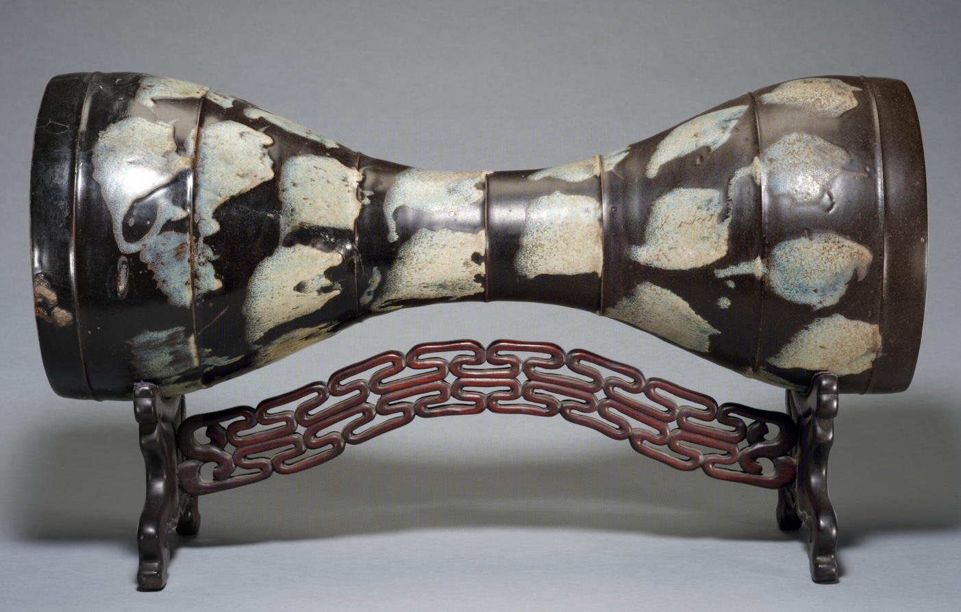 - 腰鼓为长形,两头粗中腰细,长 58.9 厘米,鼓面直径 22.2 厘米腰鼓广口,纤腰,鼓身凸起弦纹 7 道。通体施黑釉,在匀净的釉上点缀以几十块蓝色彩斑,在漆黑匀净的釉面上显现出片片蓝白色斑块,优美、静穆而典雅