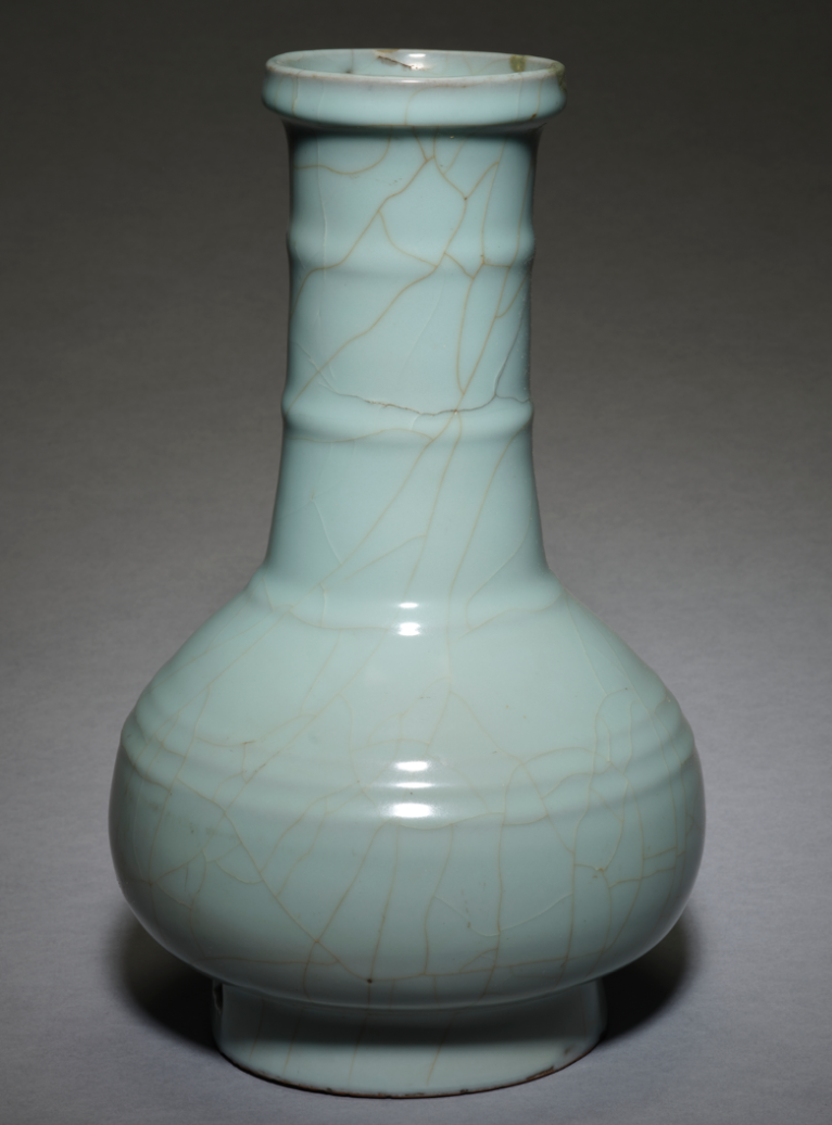 “冰裂纹”:瓷釉开片系因胎、釉膨胀系数不同而在焙烧后冷却时所形成,在瓷器流传过程中如遇冷热变化仍会继续开裂。它本属于釉的一种缺陷,但因其片纹自然天成、生动有趣,遂逐渐被视作一种特殊的装饰。这种工艺缺陷在宋代被赋予独特审美价值,成为后世鉴定汝窑瓷器的重要标准之一