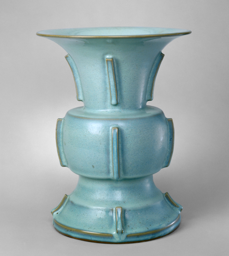- 高 32.6cm,口径 26cm,足径 21cm;该器仿青铜器造型,呈喇叭形口、扁鼓形腹、外撇圈足,颈腹足四面饰条形方棱(出戟)。通体施月白釉,釉面密布气泡并伴有棕眼现象,器身边棱处因高温熔融形成黄褐色胎骨显露