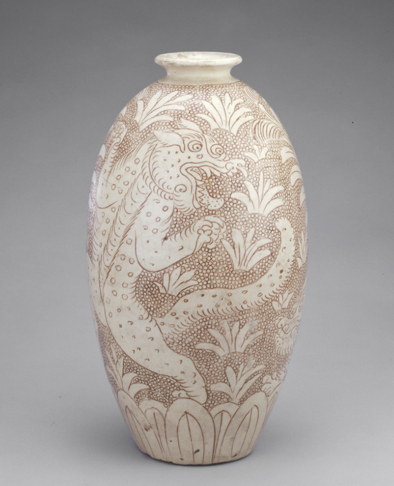 - 瓶高32.3厘米,口径7.3厘米,足径9.5厘米。瓶形似橄榄,圈足。胎为灰褐色,施白色化妆土。瓶身刻划二虎,一站立,一行走,呲牙翘尾,均矫捷凶猛, 搏斗于草丛中,衬以洞石、芭蕉,近底处有一周莲瓣纹。图案以外空白处戳印珍珠形小圆圈