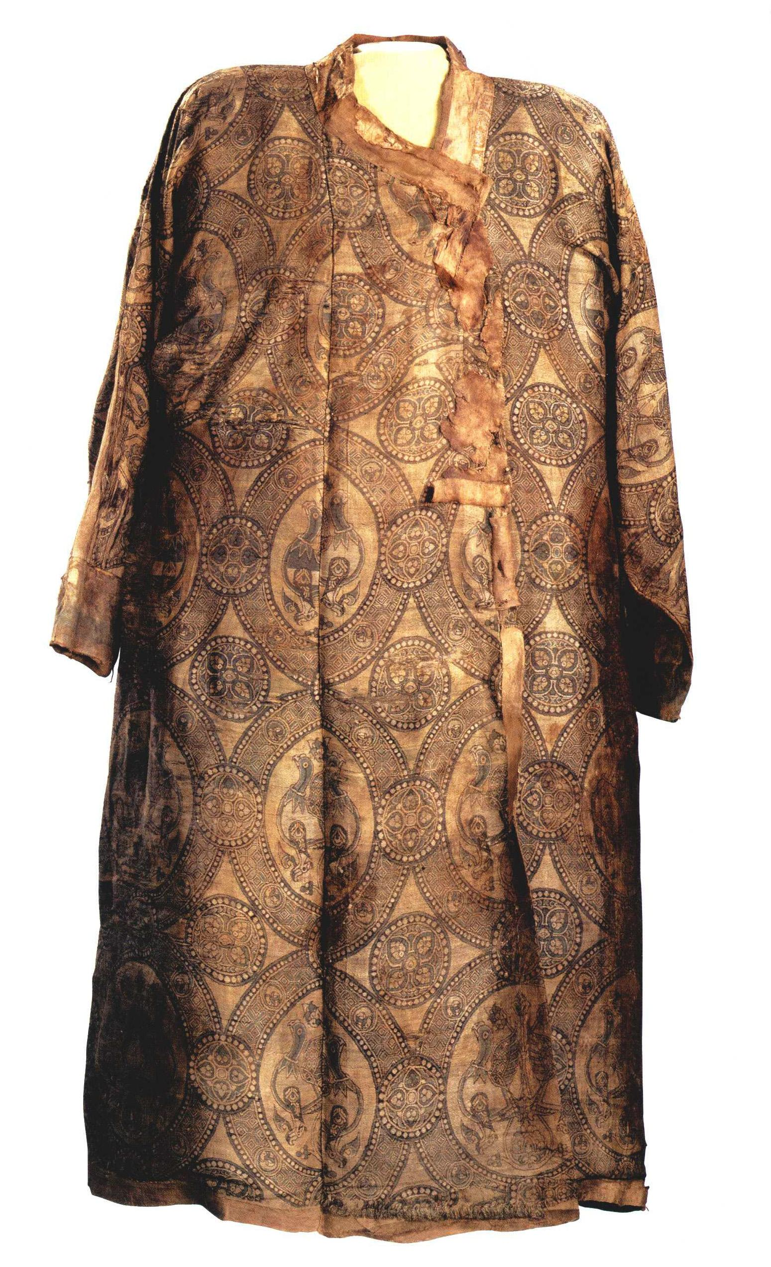 - 纹锦袍身长138厘米,两袖通长194厘米,袖口宽15厘米,下摆宽81厘米。袍半掩襟,交领,窄袖,后身开禊至高于臀部处,领口、袖口、衣襟外缘羊皮“出凤”。袍身用料为三枚左向斜纹纬棉,图案为宋代流行的毬路纹,纹内饰一对灵鹫相背而立
