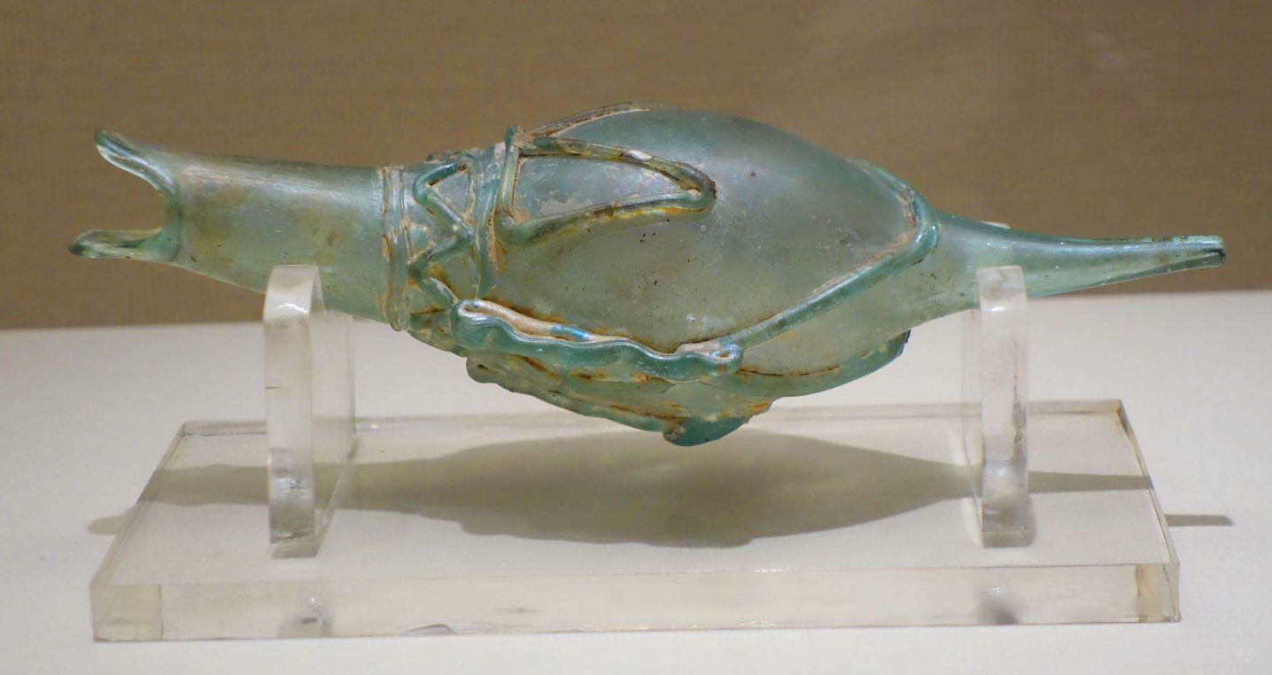 - 鸭形玻璃注长20.5厘米,腹径5.2厘米;质薄透明,表面微见银绿色锈浸,以吹管法成型。体横长,形如鸭状,流如大张之鸭嘴,长颈鼓腹,拖一细长尾,尾尖微残;器表梢闪淡绿色,半透明,体横长。此器重心在前,只有腹部充水至半时,因后身加重,才放得稳