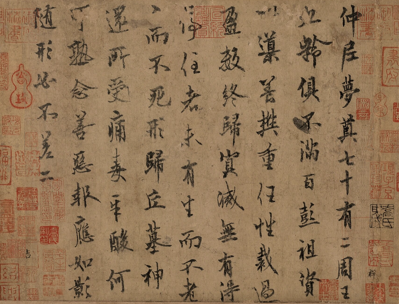 - 《仲尼梦奠帖》释文以“仲尼梦奠”开头,共七十八字,文字叙孔子梦奠之事, 有佛教无常、报应之意。无款印;书法笔力苍劲古朴,用墨淡而不浓,以秃笔疾书,转折自如,无一笔不妥,无一笔凝滞,上下脉络映带清晰,结构稳重沉实,运笔从容,气韵流畅,体方而笔圆,妩媚而刚劲