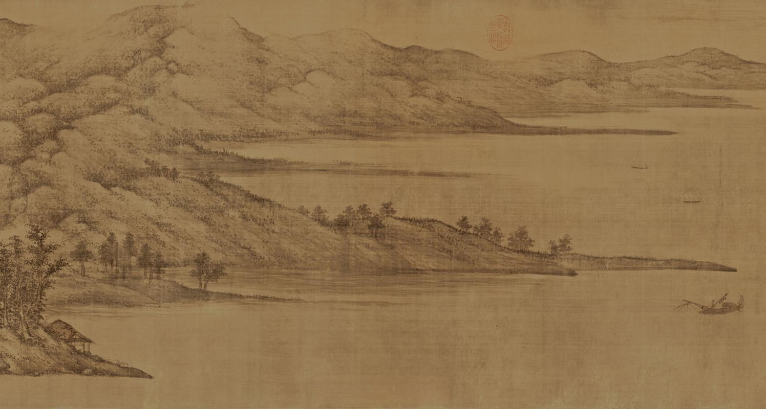 - 图中山势重叠,缓平绵长,植被丰茂,水汽若蒸,似江南夏日景色。起首处水面浩渺,扁舟隐现,中景山势重叠,林木疏朗挺直,竹丛杂处其间,茅屋隐约可见;卷末渡船未到,官客等待,点出主题