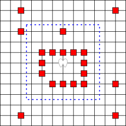 - 图中棋盘区域中央为天使,当天使力量为 3 时,其当前可移动区域被蓝色点画线围起