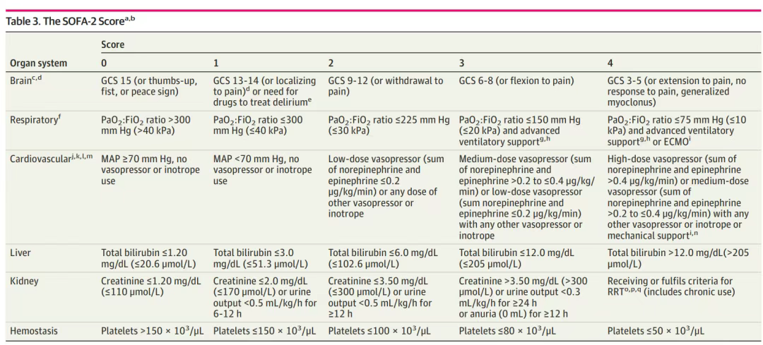 - SOFA评分对6项功能器官(呼吸、心血管、肝脏、凝血、肾脏和神经系统)进行打分。单个功能器官分值范围是[0-4],sofa评分范围是[0-24]分。多器官衰竭定义为有两个或多个器官评分≥3