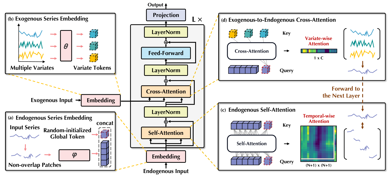 - (b)对于外生时间序列,每个序列都单独计算嵌入表示,最终每个外生变量序列都有一个变量级嵌入表示