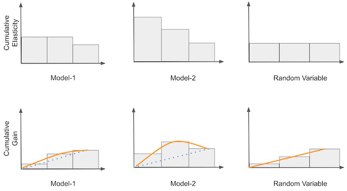 - 累积增益曲线与随机曲线的偏差越大,模型越好(Model-2 优于 Model-1)