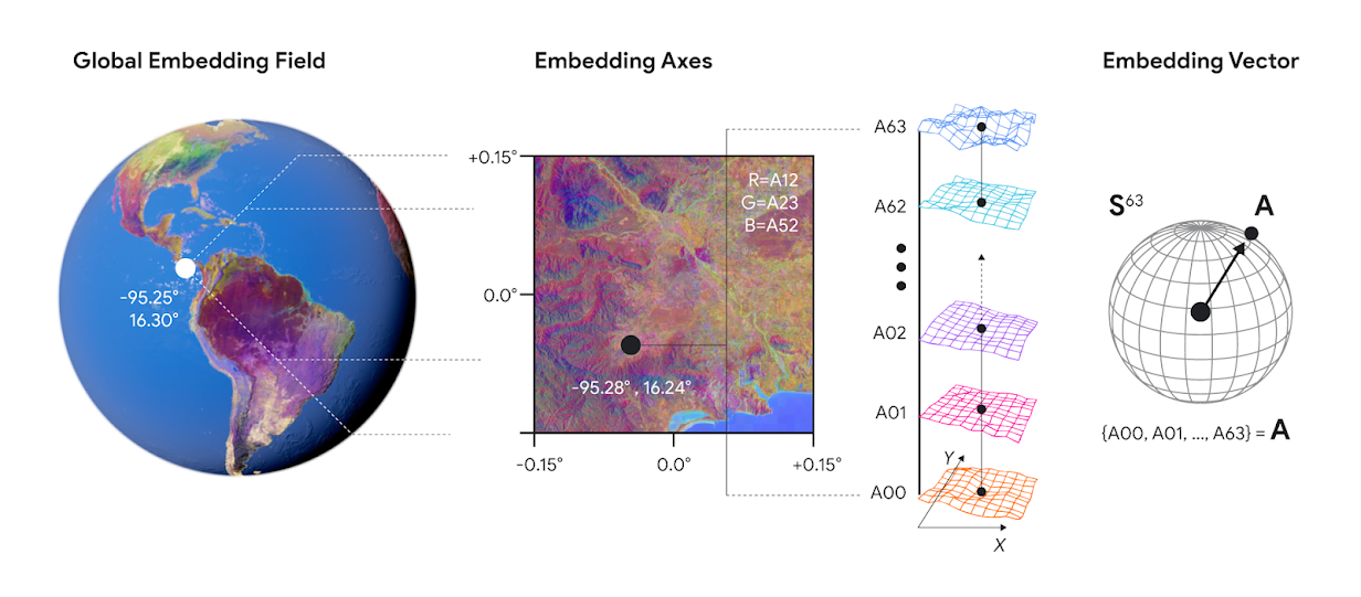 - AlphaEarth 整合了来自数十个不同公共来源的大量信息——光学卫星图像、雷达、三维激光测绘、气候模拟等。它将这些信息编织在一起,并针对 10x10 米的地理区域信息形成的统一嵌入表示