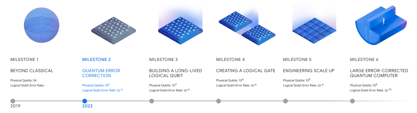 - 里程碑 2:实现量子纠错,通过增加量子比特的规模来指数级减少错误(2023 年)