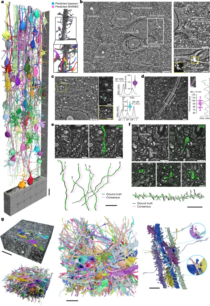 - 图像说明:(a)小鼠初级体感皮层局部重建的 79 个示例细胞(b)对锥体神经元的细胞内结构和初级纤毛的局部放大(c)树突棘和细胞核的局部放大(d)神经突起周缘的周期性结构(e)轴突追踪的“金标准”验证,重建后的轴突和真实情况高度吻合(f)树突与树突棘追踪的验证(g)不同视角下 658 个细胞结构的人工彩色标记和完整三维渲染图