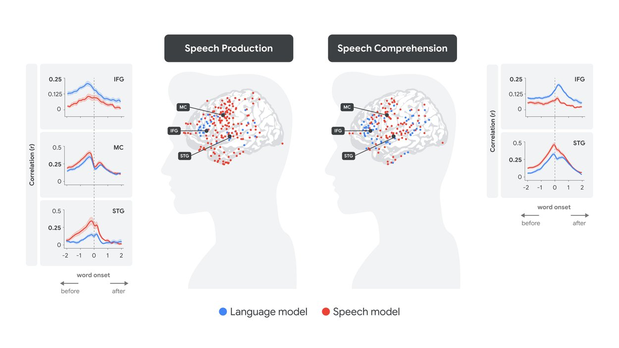 - 在发音前约 500 毫秒(受试者准备发音下一个词时),文本嵌入(蓝)预测了布罗卡区(IFG)的皮层活动;几百毫秒后(仍在词语出现之前),语音嵌入(红)预测了运动皮层 (MC)的神经活动;说话者发音之后,语音嵌入预测了颞上回(STG)听觉区域的神经活动
